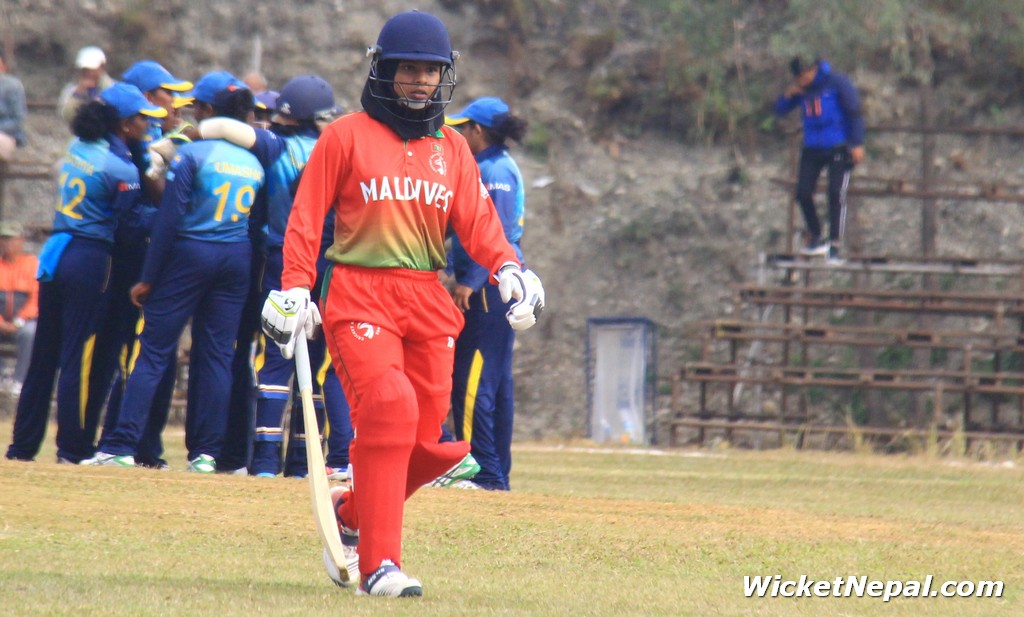 टस जितेर माल्दिभ्सले श्रीलंकालाई ब्याटिंगको निम्तो दिएपछि श्रीलंकाले २० ओभरमा २ विकेट गुमाएर २७९ रन बनाएको थियो। २७९ रनको योगफल महिला टि-२० अन्तर्राष्ट्रियमा तेश्रो ठुलो योगफल हो। २८० रनको लक्ष्य पछ्याउने क्रममा माल्दिभ्स १४.५ ओभरमा ३० रनमै समेटिन पुग्यो।